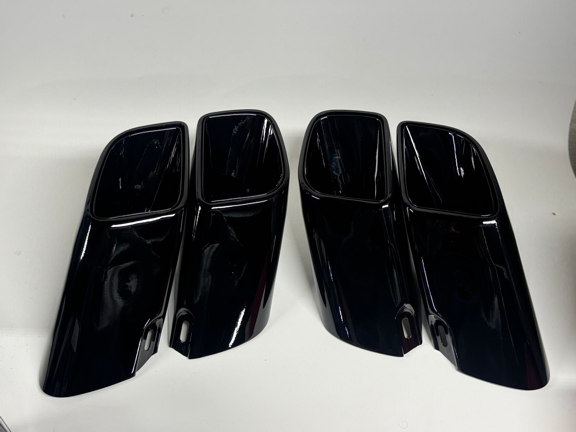 These are the standard square style turbo tips, and have been powdercoated gloss black. They look brand new.